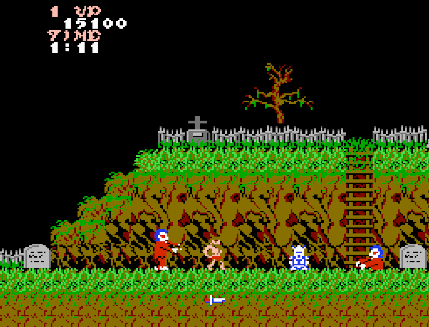 One of the greatest videogame sight gags occurs when Arthur is struck by a creature of the night. His suit of armour will fall away leaving him to fend for himself whilst wearing only his underwear. Unfortunately, if Arthur is struck once more then he's reduced to a pile of bones. This would also reduce the embarrassment of walking around in his smalls, but not in the way one would have hoped.